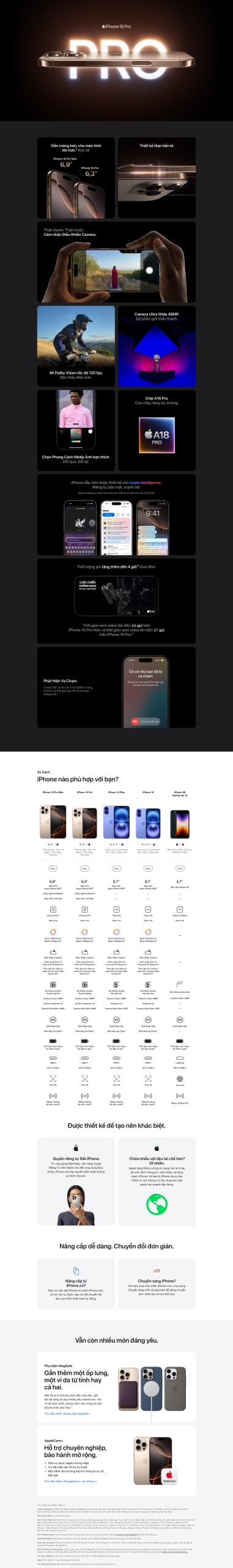 1Màn hình có các góc bo tròn. Khi tính theo hình chữ nhật, kích thước màn hình theo đường chéo là 6,12 inch (iPhone 16), 6,69 inch (iPhone 16 Plus), 6,27 inch (iPhone 16 Pro) hoặc 6,86 inch (iPhone Pro Max). Diện tích hiển thị thực tế nhỏ hơn.