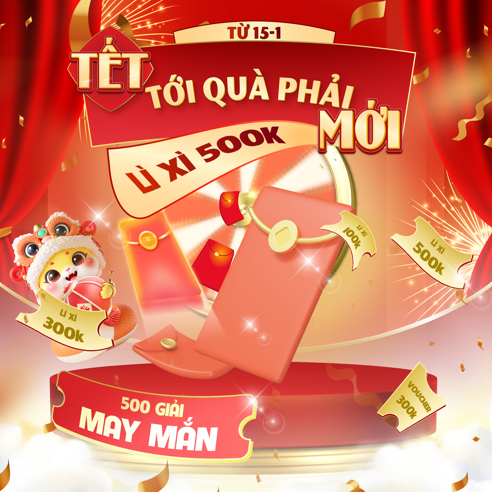 500 giải MAY MẮN  :  Lì xì 500k, lì xì 200k, lì xì 100k, hàng ngàn voucher mua hàng cực hấp dẫn